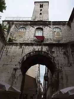 The Iron Gate (Croatian: Željezna vrata, Latin: Porta ferrea), or "the Western Gate", is one of the four principal Roman gates into the stari grad (old town) of Split that was once Diocletian's Palace. Originally a military gate from which troops entered the complex, the gate is the only one to have remained in continuous use to the present day.