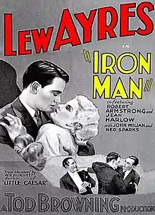 Iron Man is a 1931 American pre-Code sports drama film directed by Tod Browning and starring Lew Ayres and Jean Harlow.[1] In 1951, Universal remade the film with Jeff Chandler, Evelyn Keyes and Rock Hudson, directed by Joseph Pevney.