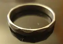 The Iron Ring is made from either iron or stainless steel.[9] It is intended to be worn on the little finger of the working (dominant) hand.[9] There, the facets act as a sharp reminder of one's obligation while the engineer works, because it could drag on the writing surface while the engineer is drawing or writing.[8] This is particularly true of recently obligated engineers, whose rings bear sharp, unworn, facets. Protocol dictates that the rings should be returned by retired engineers or by the families of deceased engineers. Some camps offer previously obligated or "experienced" rings, but they are now rare due to medical and practical complications.