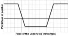 The position is so named because of the shape of the profit/loss graph, which replicates that of a condor but with a different combination of options. Traders often refer to the inner options collectively as the "body" and the outer options as the "wings". The word iron in the name of this position indicates that, like an iron butterfly, this position is constructed using both calls and puts, by combining a bull put spread with a bear call spread. The combination of these two credit spreads makes the long iron condor (and the long iron butterfly) a credit spread, despite the fact that it is "long." This distinguishes the position from a plain Condor position (and the plain Butterfly), which would be constructed with all calls or all puts, by combining either a bull call spread with a bear call spread or a bull put spread with a bear put spread. Because the long, plain Condor (and Butterfly) combine a debit spread with a credit spread, that overall position is instead entered at a net debit (though usually small).[1]