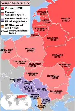 - The People's Republic of Albania[46] (which re-aligned itself in the 1950s and early 1960s away from the Soviet Union towards the People's Republic of China (PRC) and split from the PRC towards a strongly isolationist worldview in the late 1970s)