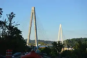 The Ironton–Russell Bridge can refer to either one of two bridges that carry/carried traffic along the Ohio River between Ironton, Ohio and Russell, Kentucky in the United States. The original light-blue cantilever Ironton-Russell Bridge, opened in 1922 and closed in 2016, carried two lanes of traffic and a narrow sidewalk. The new white cable-stayed bridge, officially named the Oakley C. Collins Memorial Bridge, has two lanes of traffic without a dedicated sidewalk and opened on November 23, 2016.