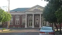 Built of brick on a brick foundation,[4] the depot is a single-story building with a simple plan: shorter wings radiate out from both sides of the taller central structure.[2] Separate hip roofs cover the central and side sections, except for the section above the main entrance, at which the roofline deviates to provide shelter as far as the edge of the street. Covered with a gabled roof, this extension features a four-pillar facade topped with a pediment and entablature. Smaller and simpler entrances are located to the sides of the building,[4] which has a total area of approximately 5,000 square feet (460 m2).[3] Elements such as the main entrance combine to make the building a clear example of the Neoclassical style of architecture.[2]
