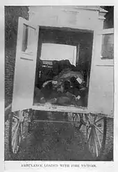 Foy, who was preparing to go on stage at the time, ran out and attempted to calm the crowd, first making sure that his young son was in the care of a stagehand. He later wrote, "It struck me as I looked out over the crowd during the first act that I had never before seen so many women and children in the audience. Even the gallery was full of mothers and children."[16] Foy was widely seen as a hero after the fire for his courage in remaining on stage and pleading with patrons not to panic even as large chunks of burning scenery landed around him.[20]