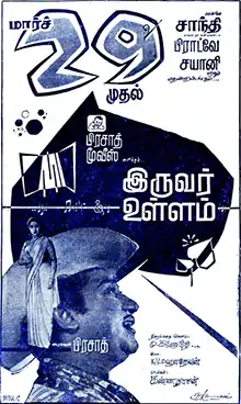 Iruvar Ullam was released on 29 March 1963, and distributed by Sivaji Films.[11] It was promoted as a "newspaper cutting that featured pencil sketches of two hearts", each displaying the name of the lead actor and actress.[19] On 9 April, The Indian Express wrote that it "has one significant and rare virtue. Its basic dramatic design is of a lightly pleasant variety, with the sweet underlining of a playful romance".[20] On 21 April, the magazine Kalki positively reviewed the film, praising Saroja Devi for delivering a very natural performance.[21] The film was a commercial success, running for over 100 days in theatres.[22][23] Lakshmi who saw the film was shocked with the twist of the protagonist being blamed for the murder as she felt the film completely deviated from her novel.[7]
