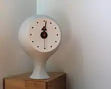 Later Nelson got the Howard Miller Clock Co. account, and Harper was given the responsibility of handling it.[1] Harper decided to create clocks that were a piece of sculpture. "To omit numbers and have an abstract object that moved on the wall was something no one was doing at the time". He would design a group of about eight clocks once or twice a year, which were sent to Howard Miller Clock Co. Most were put into production.[1] Many of Harper's wall and desk clocks are now being manufactured by Vitra.