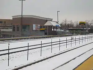 Irving Park is a railroad station on Metra's Union Pacific Northwest Line located in the Irving Park neighborhood of Chicago, Illinois. The station is elevated on a solid-fill embankment which parallels the Kennedy Expressway. It is located adjacent to a station of the same name on the Blue Line. The station contains two side platforms; the southwest platform serves outbound trains, and the northeast platform serves inbound trains. A third express track runs through Irving Park but does not stop there. Irving Park is located in the B zone in Metra's zone-based fare system. As of 2018, Irving Park is the 110th busiest of Metra's 236 non-downtown stations, with an average of 439 weekday boardings.[1]