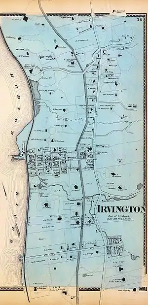 Irvington, sometimes known as Irvington-on-Hudson,[3] is a suburban village in the town of Greenburgh in Westchester County, New York, United States. It is located on the eastern bank of the Hudson River, 20 miles (32 km) north of midtown Manhattan in New York City, and is served by a station stop on the Metro-North Hudson Line. To the north of Irvington is the village of Tarrytown, to the south the village of Dobbs Ferry, and to the east unincorporated parts of Greenburgh, including East Irvington. Irvington includes within its boundaries the community of Ardsley-on-Hudson, which has its own ZIP code and Metro-North station, but which should not be confused with the nearby village of Ardsley.