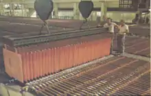 The original cathode stripping machine was based on that used at the Hikoshima plant of the Mitsui Mining and Smelting Company of Japan.[2] However, considerable development work was necessary to modify the design to handle the copper cathodes, which were heavier than those at Hikoshima, and to process the cathode plates without damaging them.[2] The machines also had to be redesigned to allow for waxing the sides and bottoms of the cathode plates to allow the next copper cathode sheets to be removed easily.[2]