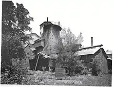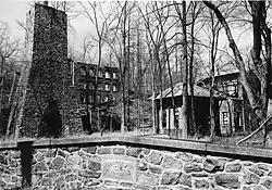 In 1891, Col. Potts began building a nearby chateau-like mansion, "Langoma" (1891–95, Theophilus P. Chandler, Jr., architect),[15] which he intended as a residence for himself and his son William.[16] However, he died in December 1893 and did not live to see it completed. William, his wife, and mother did move into "Langoma", but ironmaking at the furnace ended in April 1894, not long after Col. Potts' death. It was the last iron furnace operating in Chester County.[3] The furnace and railroad spur were left largely intact, although unused. The slow dilapidation of the furnace produced a remarkable aesthetic effect. Henry Seidel Canby referred in 1935 to "its moldering cupola furnace, like a Persian mosque of the twelfth century, its long walls and sleepy half-drained dam."[17] This slow decay was accelerated after the death of William M. Potts in 1943, when the railroad was taken up and other metal was reclaimed for scrap. Even after this, HABS photographer Ned Goode said of the furnace in 1959 that "its wild setting in an over-grown field is quite striking".[3]