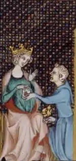 At the All Saints Parlement in 1254, Theobald of Navarre requested Isabella's hand in marriage.[2] In an attempt to resolve the inheritance of Navarre, Louis declined Theobald's request until he reconciled with his sister, Blanche of Brittany.[2] Upon the reconciliation, Louis agreed to Isabella marrying Theobald.[2] The Archbishop of Rouen celebrated the marriage between Isabella and Theobald II, King of Navarre and Count of Champagne, on 6 April 1255 in Melun. [3] Isabelle became Queen consort of Navarre.