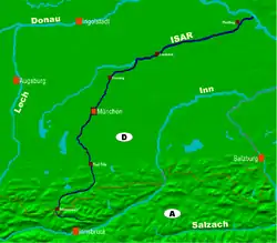 The Isar [ˈiːzaʁ] is a river in Austria, and Bavaria. Its source is in the Karwendel mountain range of the Alps. The Isar river enters Germany near Mittenwald and flows through Bad Tölz, Munich, and Landshut before reaching the Danube near Deggendorf. With 295 km length, it is among the longest rivers in Bavaria. It is Germany's second most important tributary of the Danube.