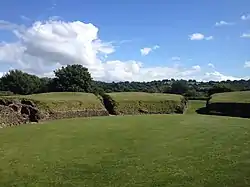 Headquarters of the Legion "II Augusta", which took part in the invasion under Emperor Claudius in 43, Isca is uniquely important for the study of the conquest, pacification and colonisation of Britannia by the Roman army. It was one of only three permanent legionary fortresses in later Roman Britain and, unlike the other sites at Chester and York, its archaeological remains lie relatively undisturbed beneath fields and the town of Caerleon and provide a unique opportunity to study the Roman legions in Britain. Excavations continue to unearth new discoveries;[1] in the late 20th century a complex of very large monumental buildings outside the fortress between the River Usk and the amphitheatre was uncovered. This new area of the canabae was previously unknown.[2]
