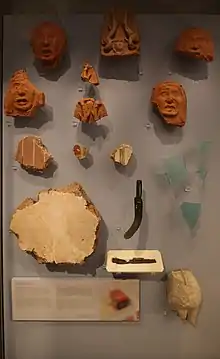 Buildings within the fortress, such as barracks, granaries, and workship (fabrica), were timber structures, the post-trenches of which were excavated in the 1970s in advance of the Guildhall shopping centre development. The only known building in the fortress not of timber was a stone-built military bathhouse. The water for the bathhouse was supplied by a natural spring via an aqueduct which entered the fortress through the rear gate (porta decumana). The excavations revealed the hot room (caldarium) and part of the warm room (tepidarium). The bathhouse was also supplied with an external exercise yard (palaestra), one corner of which was a cockfighting pit.[6]