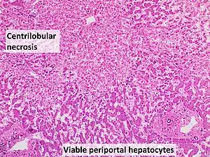 | Histopathology of shock liver, showing its hallmark[1] pathologic finding centrilobular necrosis but viable periportal hepatocytes. H&E stain. The necrotic hepatocytes have barely discernible nuclei. | |
