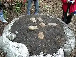 The site consists of three large stone circles located on an artificially flattened plateau on the west bank of the Yoneshiro River. The largest circle is between 42 and 45 meters in diameter, and completely encloses a fourth stone circle. The stones, including porphyrite, rhyolite and tuff, were brought from rivers up to five kilometers away, and the site has a moat on its eastern side with a length of more than 100 meters. More than 100 pits have been found, both inside and outside the stone circles, containing terracotta plates and jars, and small clay objects along with hunting and fishing implements and everyday tools. No bones have been found, but soil discoloration indicates that the site was a necropolis and the objects found were ritual or grave-goods.[1] Some 200 clay dogu have also been found on the site, many of which appear to have been intentionally broken. One of the stone circles contains a standing stone which appears to have served as a sun dial.