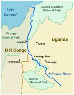 The Ishasha is a river in southwest Uganda, forming part of the border with the Democratic Republic of the Congo. It runs from its source north of Kabale to its mouth at Lake Edward.[1][2] Its length is very roughly 100 kilometres (62 mi) ignoring the many small meanders.