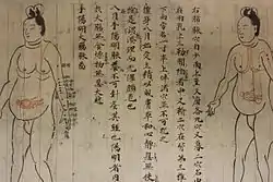 The Ishinpō preserved more than 200 important medical documents that were all Chinese in origin and no Japanese sources.[1] The medical knowledge in the tome covered clinical treatments that drew from the ancient Chinese traditional medicine and influenced by Indian medical theories found in Buddhist scriptures as well as Taoist references (e.g. Taoist drugs).[1] For instance, there was the so-called Scripture on Pregnancy, which outlined the physical developments and fetal movements.[4] Scholars cite its similarity with a prescription from the old Chinese medical text called Taichan shu, which contained doctrines about the development of embryo and fetus as well as proper hygiene for pregnant women.[5]