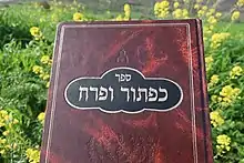 Ishtori Haparchi was the author of the first Hebrew book on the geography of the Land of Israel,[6] Sefer Kaftor va-Ferach (Hebrew: ספר כפתור ופרח), literally "Book of Bulb and Flower",[2] or "Knob and Flower," written in 1322 in the Land of Israel and published in Venice in 1549.[4] "Knob and Flower" is a Hebrew idiom meaning "work of art," and is derived from the description of the menorah in Exodus 37:17. In the context of the book it refers to the agrarian laws practised by the nation of Israel. Haparchi lists the names of towns and villages in the Land of Israel and discusses the topography of the land based on first-hand visits to the sites. He describes its fruits and vegetables, and draws upon earlier rabbinic commentaries, such as the commentary compiled by Rabbi Isaac ben Melchizedek of Siponto.[7]