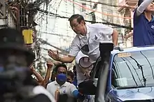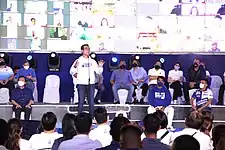Isko Moreno was reportedly to take his oath as a member of Aksyon Demokratiko, the party founded by Senator Raul Roco, in September 2021.[14] This was after he resigned from the National Unity Party.[15] However, this did not happen as an unexpectedly large number of people turned up on vaccination sites, particularly in Manila.[16] Moreno was subsequently elected party president a week later.[17] He later announced his presidential bid on September 22 with Dr. Willie Ong as his running mate.[18] They filed their certificates of candidacy (COCs) on October 4.[19]
