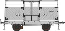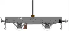 In 1967 as part of a short-lived experiment to use the railway to carry container traffic, under the title of "Man-Tainor", a new "R" class was created as below using former 'Pairs' coach underframes, the bodies of which were removed and dumped in the goods yards at St. John's and Castletown; no stock carries this prefix today, the frames having been sold off in 1974 to the scrap dealer Manx Metals, the experiment having ceased in 1968. The series letter and numbering were entirely unofficial, having been applied by a party of visiting enthusiasts.[3] The numbers were applied in the order they found the vehicles, not in order of their former F numbers. The exact correspondence between R and F numbers in not known. R3 was converted to a rather unsatisfactory well wagon and was cut up by Manx Metals, but the remaining ten were purchased from MM by the Festiniog Railway[4] where six have been used under new coaches and two as wagons.