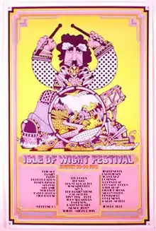 The Isle of Wight Festival 1970 was a music festival held between 26 and 31 August 1970 at Afton Down, an area on the western side of the Isle of Wight in England. It was the last of three consecutive music festivals to take place on the island between 1968 and 1970 and often acknowledged as the largest musical event of its time, with a larger attendance than Woodstock.[1][2] Although estimates vary, Guinness World Records estimated 600,000 to 700,000 people attended.[3] It was organised and promoted by local brothers, Ron and Ray Foulk through their company Fiery Creations Ltd and their brother Bill Foulk. Ron Smith was site manager and Rikki Farr acted as compere.