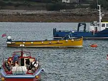 - MV Tean — operated by the ISSC 1952–early 1990s. Built as a Royal Navy harbour launch number 183942, at Dickie's yard, Bangor in 1941.[21] Length 53 feet (16 m). Gross tonnage 20.65. Registered tonnage 9.30. 12 ft beam. She was brought to Scilly in her original Naval state from Worcester, helmed by Clifford Jenkin, with motor engineer JT Lethbridge in attendance. Like MV Kittern, she underwent an extensive refit on Scilly, which included the replacement of her original power plant with a new L. Gardner and Sons 6 cylinder 6LW diesel engine, larger wheelhouse, the replacement of her forward cabin with a cargo hold, new funnel and the addition of high timber bulwarks.[24] She underwent another ISSC refit in 1983, which included the replacement of her timber gunwales with steel railings and a replacement 'modern' funnel. She has been in various private hands 1990s-2021. She was based in Bideford for a time in the early 2000s, and made local headlines when on passage from Bideford to Lydney, when she got into difficulties at Portishead, was refused entry into Portishead Marina, and had to be beached just outside the marina. Here she remained for several months whilst repairs were undertaken, and she eventually made it to Lydney. Her current (2021) location is Bullo Pill, off the Severn estuary.
