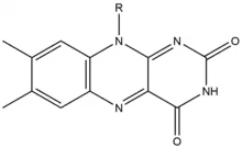 Isoalloxazine is the structural foundation of flavins such as riboflavin (vitamin B2) and is a heterocyclic compound.[2] It has a tricyclic structure which means it has three interconnected rings of atoms and is a tautomer of alloxazine.[1] The structure is formed by primary-secondary aromatic o-diamines and they are a high-melting crystalline substance.[1] The R-group is used to attach various flavin groups It has a similar structure to pteridines which has two interconnected rings.[1] Isoalloxazine was first obtained in 1934[1] by Richard Kuhn an Austrian-German biochemist and lab mates.