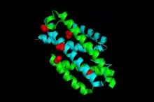 IPL consists of an intertwined dimer with two equal active sites. Each monomer has three helices, and both actives sites are composed of residues from each of the two monomers.[4] A loop between the first and second helices provide an opening for the substrate to enter and product to exit.[5] In that loop is a positively charged lysine at residue 42, which acts as a lid for this active site. This lysine is essential for the enzyme's most efficient method of producing salicylate. It is the positive charge on lysine 42, combined with the organization of the substrate once it enters the active site, that allows for the enzyme's transition state stabilization.[3] Before being bound to its substrate, IPL will have nitrates bound to its open active site.[5]