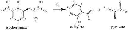 Isochorismate pyruvate lyase (IPL, EC 4.2.99.21) is an enzyme responsible for catalyzing part of the pathway involved in the formation of salicylic acid. More specifically, IPL will use isochorismate as a substrate and convert it into salicylate and pyruvate. IPL is a PchB enzyme originating from the pchB gene in Pseudomonas aeruginosa.[1]