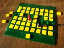 The first player moves their pawn 1 square in any direction, and then selects and removes any tile on the board, leaving an empty square that cannot be entered by either pawn. The second player performs the same sequence, moving their pawn and removing any tile. Play then alternates between the two players.[1]