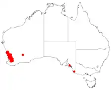 Isopogon dubius grows in woodland and heath, mainly on the Darling Range from near Wongan Hills to Narrogin in the Avon Wheatbelt, Geraldton Sandplains, Jarrah Forest and Swan Coastal Plain in the south-west of Western Australia.[2][3]