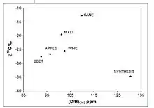 Thus, by comparing the specific natural isotope fractionation corresponding to each site of a molecule of ethanol of wine with that of a molecule known and referenced in a database. The geographical origin, botany and method of production of the ethanol molecule and thus the authenticity of wine can be checked.[9]