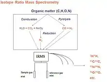 The isotopic ratios of a molecule can also be determined by isotope ratio mass spectrometry (IRMS), sample quantity for IRMS is much lower than for NMR, and there is the possibility of coupling the mass spectrometer to a chromatographic system to enable on-line purification or analyses of several components of a complex mixture. However the sample is burnt after a physical transformation such as combustion or pyrolysis. Therefore, it gives a mean value of the concentration of the isotope studied between all sites of the molecule. IRMS is the official AOAC technique used for the average ratio 13C/12C (or δ13C) of sugars or ethanol, and the official CEN and OIV method for the 18O/16O in water.