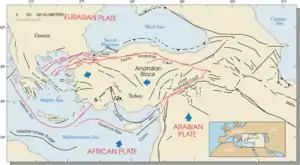 The Isparta Angle is an inverse-V-shaped morphotectonic structure located in southwestern Anatolia, to the north of the Gulf of Antalya.[1]: 33 Formed by the intersection of the Aegean and Cyprian tectonic arcs,[1]: 32–3 and located between the continental Bey Dağları and Anatolian blocks,[2]: 134 the Isparta Angle is a geologically complex area with many nappes of diverse ages and origins that were pushed onto the Menderes-Tauride platform.[3]: section 2 The Isparta Angle is a result of the Anatolian Plate's rotation from the early Paleocene to the early Pliocene.[4] This is a very seismically active area.[4] It is "characterized by a series of grabens and horsts" separated by active faults.[3]: abstract
