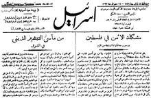 Israël was published on a weekly basis.[4] As of 1920 the magazine was distributed to several regions, including Palestine, Damascus, Beirut, Paris, Baghdad, Cyprus, Basra, Brussels, England and Thessaloniki.[1] Due to tensions about the Palestine issue the magazine was banned in Iraq in September 1933.[5]