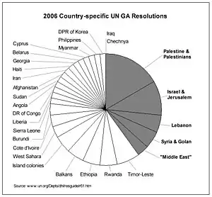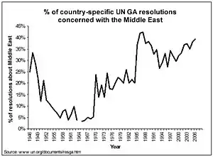 In recent years, the Middle East was the subject of 76% of country-specific General Assembly resolutions, 100% of the Human Rights Council resolutions, 100% of the Commission on the Status of Women resolutions, 50% of reports from the World Food Programme, 6% of United Nations Security Council resolutions and 6 of the 10 Emergency sessions.[72]