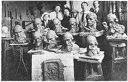 In 1910 the sculptor Chana Orloff emigrated from the Land of Israel to France and began studies in the École Nationale des Arts Décoratifs. Her work, beginning with the period of her studies, emphasizes her connection to the French art of the time. Particularly evident is the influence of Cubist sculpture, which moderated in her work with the passage of time. Her sculptures, mostly human images carved in stone and wood, designed as geometric spaces and flowing lines. A significant portion of her work is devoted to sculptural portraits of figures from French society.[12] Her connection with the Land of Israel, Orloff preserved through an exhibition of her works in the Tel Aviv Museum.[13]