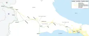 The Istanbul–Kapıkule railway is a 229 km (142 mi) long rail line currently under construction in Turkey. Once finished, this railway will provide a high-speed rail link between the Istanbul suburbs and the Bulgarian border, just West of Edirne. The rail line will be double tracked and electrified for its whole length, and is intended for use by both freight and passenger rail. The railway will allow for high-speed rail service between Edirne and Istanbul, and is intended to strengthen the rail transport link between Turkey and Europe.[1]
