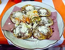 The cuisine of the region is based upon traditional foods and ingredients. Dishes may range from simple to elaborate; most dishes incorporate maize and moles. Common items include tamales made with iguana, chicken, beef or armadillo; guetabingui (fried balls of rice and shrimp); garnachas topped with dried queso Oaxaca; and pozol, a maize-based drink.[15][16]