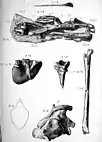 In 1913, the British amateur palaeontologist Reginald W. Hooley described two more specimens of O. latidens, collected from the sea after a rockfall near Atherfield Point on the Isle of Wight in 1904, originating from the Vectis Formation. The first of these, NHMUK R3877, was collected as three blocks and consists of a skull, neck and trunk vertebrae, a shoulder blade, an ischium, and parts of the forelimbs. The second specimen, NHMUK R3878, was collected in one block, and includes parts of the pectoral girdle and forelimbs. These specimens represent the most complete remains of Cretaceous pterosaurs found in England, and NHMUK R3877 was one of the only known three-dimensionally preserved pterosaur skeletons for much of the 20th century (pterosaur bones are often flattened compression fossils). Hooley discussed O. latidens in detail, and placed the genus Ornithodesmus in its own family, Ornithodesmidae. His article ended with a discussion wherein it was noted that the palaeontologist Charles William Andrews had expressed doubts as to whether O. latidens belonged in the genus Ornithodesmus, as the vertebrae of the specimen that genus was based on differed markedly from those of Hooley's specimen.[6][2][7] The American palaeontologist Samuel W. Williston subsequently reviewed Hooley's article, disagreeing with some of his conclusions about the anatomy and classification of the animal.[8] After Hooley's monograph, little was written about the animal for the rest of the 20th century, and no similar pterosaurs were found for decades.[9]