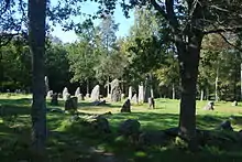 Istrehågan has been named one of the most magnificent stone settings in the Nordic countries. A burial mound with large stone settings was put up here during the Great Migration over 1,500 years ago. The largest stone setting resembles a ship and is 25 meters in length. Some stones are as tall as 4.5 meters. The width is 9 meters. The rolling lines of the gunwales are marked explicitly by the falling height of the rocks towards "midship." It is erected with tall stones at each end marking bow and stern.[4]