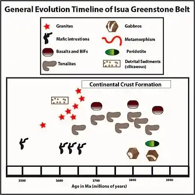 The Isua Greenstone Belt is an Archean greenstone belt in southwestern Greenland, aged between 3.7 and 3.8 billion years.[2] The belt contains variably metamorphosed mafic volcanic and sedimentary rocks, and is the largest exposure of Eoarchaean supracrustal rocks on Earth.[3] Due to its age and low metamorphic grade [4] relative to many Eoarchaean rocks, the Isua Greenstone Belt has become a focus for investigations on the emergence of life[5][6] and the style of tectonics that operated on the early Earth.[7][8]