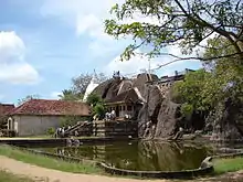 The ancient Meghagiri Vihara or Meygiri Vihara is presently identified as the Isurumuni Vihara.[1] It was built by King Devanampiya Tissa (307 BC to 267 BC) who ruled in the ancient Sri Lankan capital of Anuradhapura.[2] After 500 children of high-caste were ordained, Isurumuniya was built for them to reside.[2] King Kasyapa I (473-491 AD) again renovated this viharaya and named it as "Boupulvan, Kasubgiri Radmaha Vehera" giving the names of his 2 daughters and his name.[3] There is a viharaya connected to a cave and above is a cliff. A small stupa is built on it. It can be seen that the constructional work of this stupa belongs to the present period. Lower down on both sides of a cleft, in a rock that appears to rise out of a pool, have been carved the figures of elephants. On the rock is carved the figure of a horse. The carving of Isurumuniya lovers on the slab has been brought from another place and placed it there. A few yards away from this vihara is the Ranmasu Uyana.
