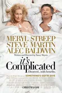 It's Complicated is a 2009 American romantic comedy film written and directed by Nancy Meyers.[4] It stars Meryl Streep[4] as a bakery owner and single mother of three who starts a secret affair with her ex-husband, played by Alec Baldwin,[4] ten years after their divorce – only to find herself drawn to another man: her architect, Adam (portrayed by Steve Martin).[4] The film also features supporting performances by Lake Bell, Hunter Parrish, Zoe Kazan, John Krasinski, Mary Kay Place, Robert Curtis Brown, and Rita Wilson, among others.[4][5]
