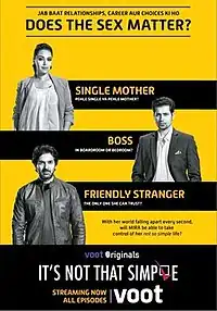 It's Not That Simple is a 2016 Indian comedy-drama web series starring Akshay Oberoi, Vivan Bhatena, Karan Veer Mehra, Swara Bhaskar, Sumeet Vyas, Purab Kohli, Manasi Rachh, Neha Chauhan, Rohan Shah and Devika Vatsa in the lead roles.[1] It was written by Charudutt Acharya and directed by Danish Aslam. It originally premiered on Voot on 21 October 2016.[2] Swara marked her web series debut with this and received praises for her performance.[3]