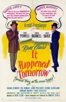 It Happened Tomorrow is a 1944 American fantasy film directed by René Clair, starring Dick Powell, Linda Darnell and Jack Oakie, and featuring Edgar Kennedy and John Philliber. It is based on the one-act play "The Jest of Haha Laba" by Lord Dunsany.