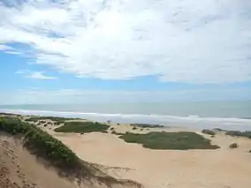 The Itaúnas State Park is in the municipality of Conceição da Barra, Espírito Santo. It has an area of about 3,481 hectares (8,600 acres).[1] It protects a strip of the Atlantic coast from north of the town of Conceição da Barra, Espírito Santo, up to the border with the state of Bahia.[2] The park is named after the Itaúnas River, which runs through the park for 34 kilometres (21 mi).[3] The river approaches the coast at the settlement of Itaúnas and then runs southwest, parallel to the coast behind a sand bar, before entering the Atlantic Ocean to the north of Conceição da Barra.[2] On the beaches of Itaúnas and Riacho Doce, which extend for 25 kilometres (16 mi), the dunes reach 30 metres (98 ft) in height.[4]