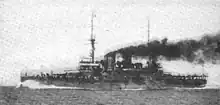 Her propulsion system consisted of two triple expansion steam engines that drove a pair of screw propellers. Steam for the engines was provided by twenty-eight coal-fired Belleville boilers, which were vented into three funnels, two of which were placed side by side. The ship's propulsion system provided a top speed of 20 knots (37 km/h; 23 mph) from 20,475 indicated horsepower (15,268 kW), and a range of approximately 10,000 nautical miles (19,000 km; 12,000 mi) at 10 knots (19 km/h; 12 mph).[1]