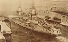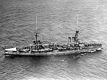 Dante Alighieri was named after the medieval Italian poet.[9] She was laid down at the naval shipyard in Castellammare di Stabia on 6 June 1909, launched on 20 August 1910, and completed on 15 January 1913.[2] The ship was used to evaluate Curtiss floatplanes in 1913–14.[10] When Italy entered World War I in May 1915, Dante Alighieri was the flagship of the 1st Battle Squadron based at Taranto and remained with the squadron through 1916. For the rest of the war, the ship was assigned to the Southern Adriatic and Ionian Sea forces.[1] Under the command of Vice Admiral Paolo Thaon di Revel, the ship was positioned to intercept any Austro-Hungarian ships based at Cattaro if they sortied to attack the Allied ships bombarding Durazzo on 2 October 1918. The Austro-Hungarians remained in harbor and Dante Alighieri did not fire her guns during the battle.[11]